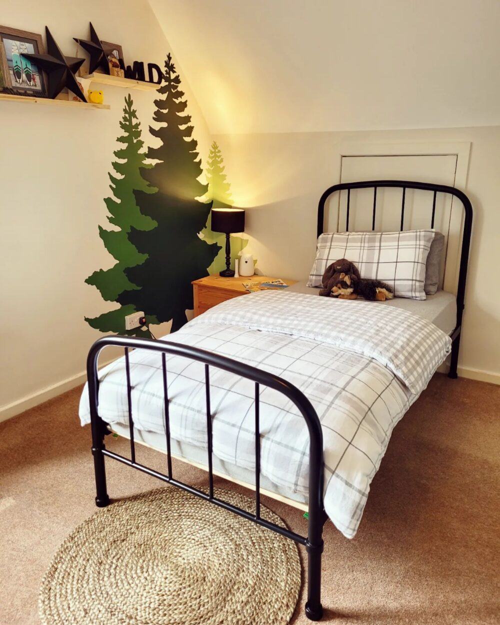 Start with a Scandi bed, such as a clean wooden bed in a light colour and a neutral palette of creams, beiges, and browns. Add snuggly layers like woollen blankets, fluffy pillows, and a shaggy rug. Simple décor like forest decals and plaid bedding adds playfulness without overwhelming the space.