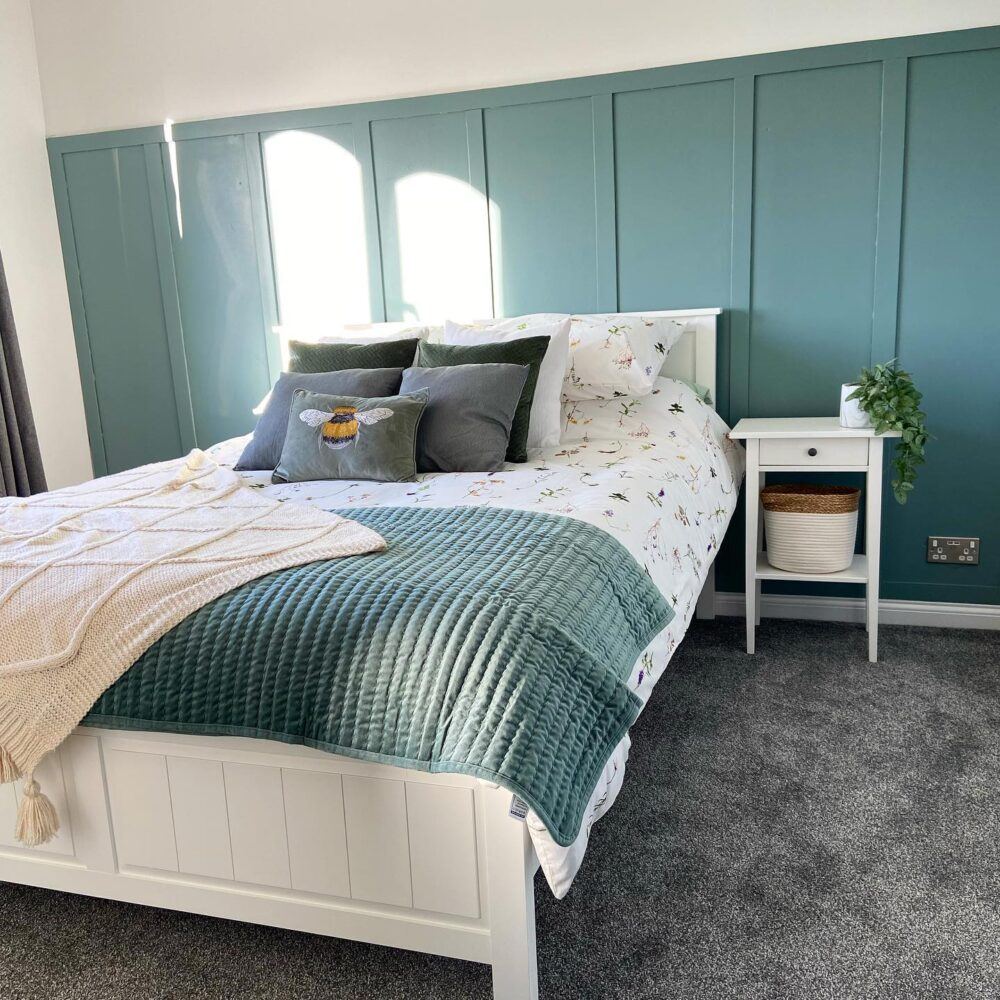 • Consider painting a statement wall in a deep teal hue to instantly elevate your bedroom’s visual impact.